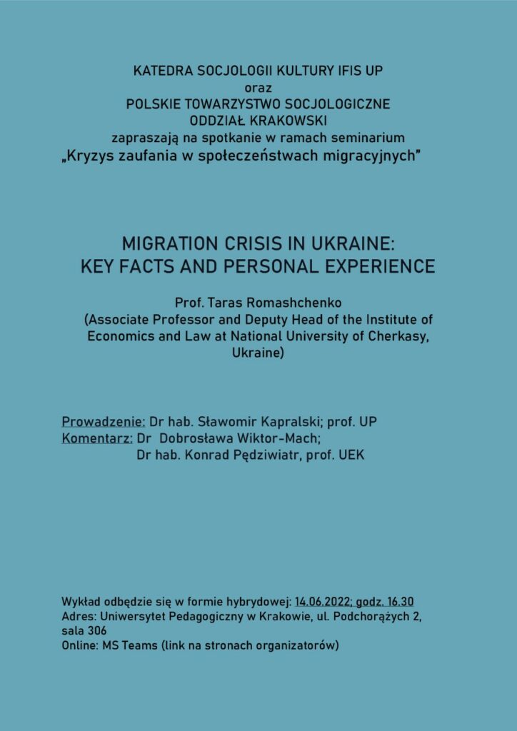 Oddział Krakowski PTS oraz Katedra Socjologii Kultury IFIS UP zapraszają na wykład i dyskusję poświęconą procesom migracyjnym w Ukrainie w kontekście toczących się działań wojennych. Wykład, uwzględniający min. perspektywę autobiograficzną, wygłosi prof. Taras Romashchenko, badacz ukraińskiej migracji z National University of Cherkasy w Ukrainie.
