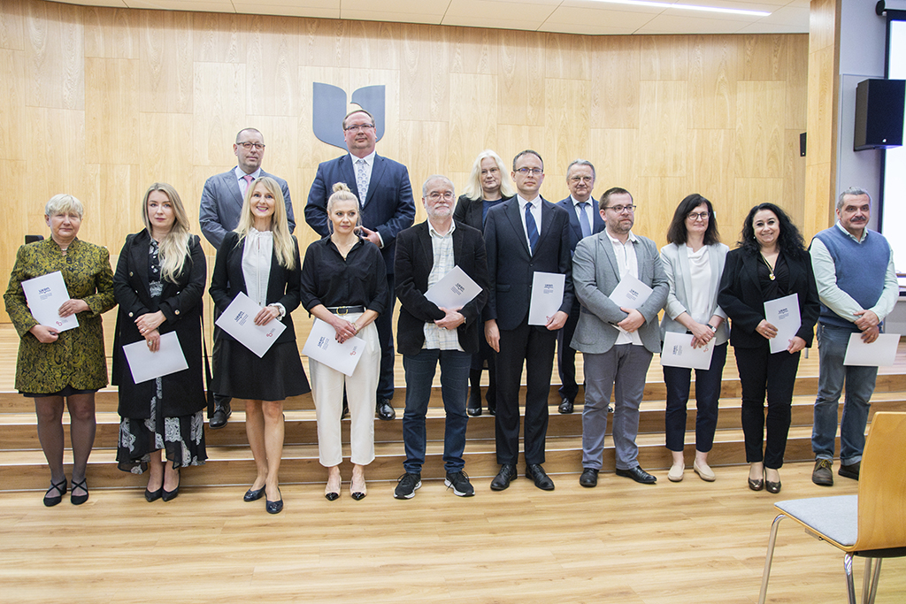 Listy gratulacyjne wyróżnionym pracownikom Uniwersytetu wraz w Rektorem wręczali Prorektor ds. Nauki dr hab. Michał Rogoż, prof. UKEN, Prorektor ds. Kształcenia i Rozwoju dr hab. Robert Stawarz, prof. UKEN oraz Prorektor ds. Studenckich dr hab. Katarzyna Plutecka, prof. UKEN.